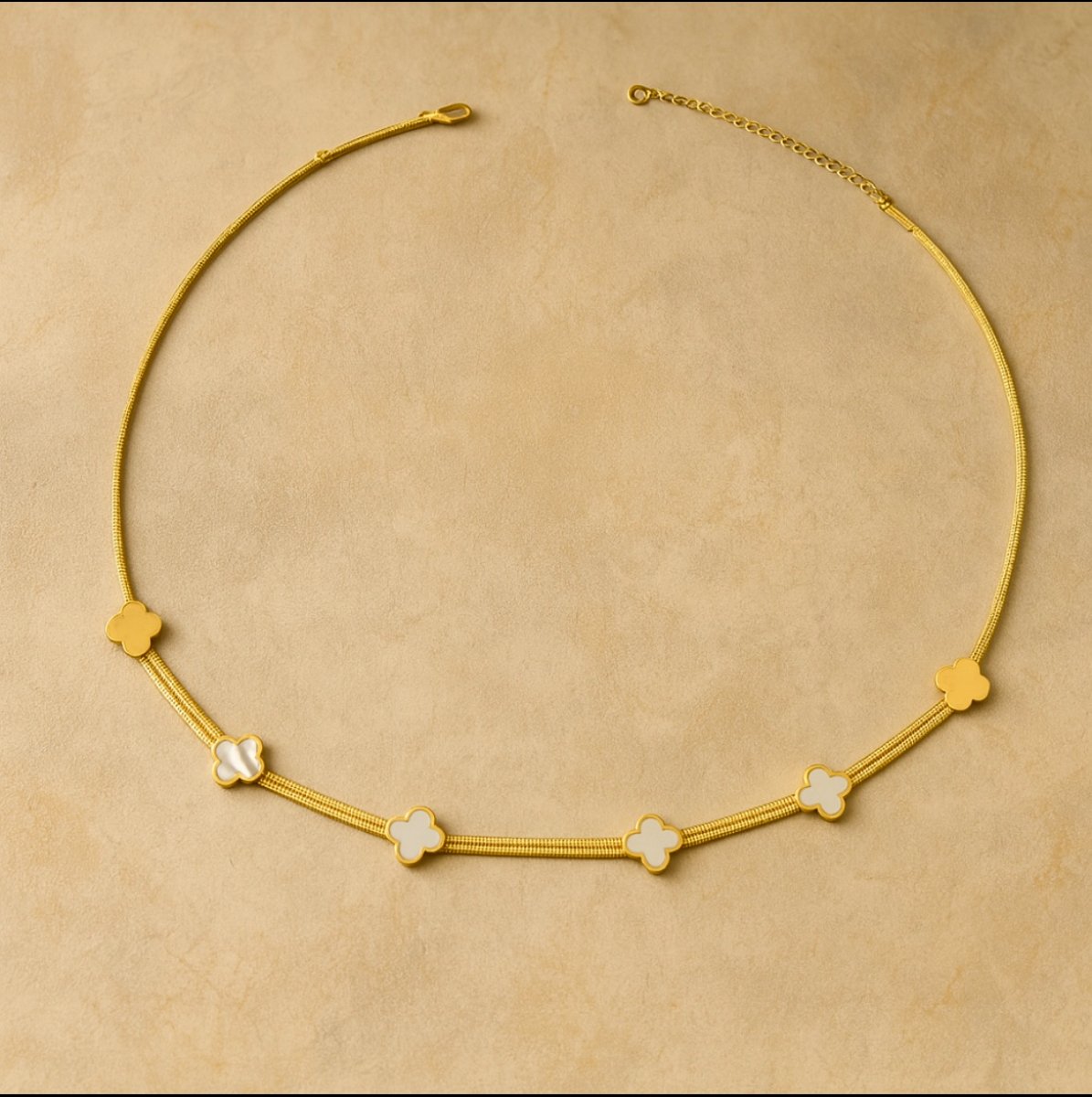 Measuring 40 cm + 5 cm extension, the Alba Pearl Love Necklace rests gracefully along the neckline, allowing the iridescent mother of pearl clovers to shimmer with every movement. Wear it solo for understated elegance, or layer it with dainty gold necklaces for a chic, stacked effect. From brunch dates to evening celebrations, this piece captures the beauty of modern luxury.