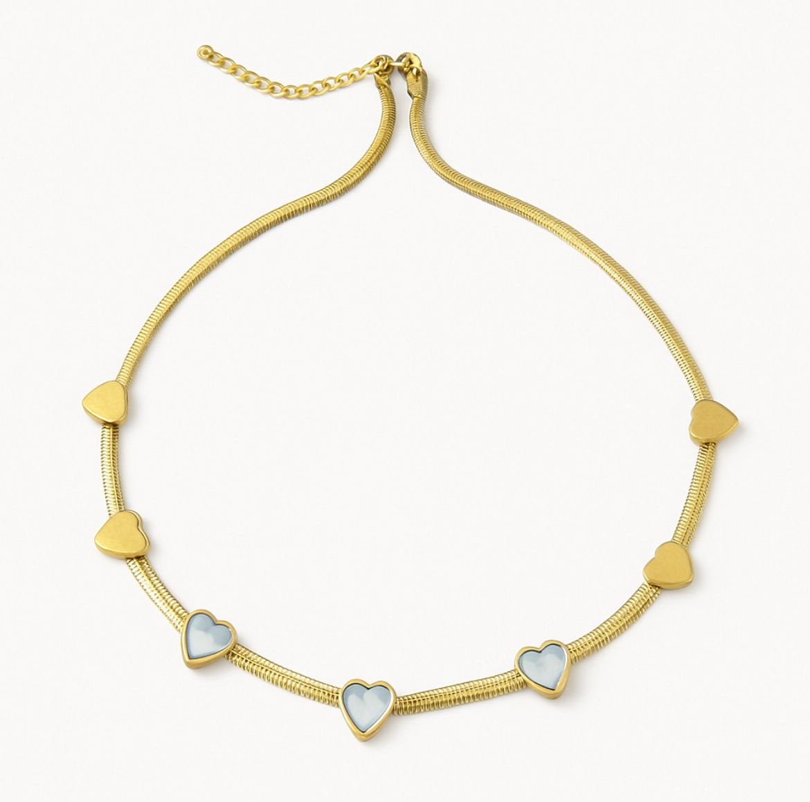 Crafted in radiant gold vermeil, the Alba Pearl Love Necklace features a sleek snake herringbone chain adorned with alternating heart charms—some in glowing mother-of-pearl, others in polished gold. Elegant yet playful, it pairs effortlessly with pearl studs, layered chains, or a gold cuff for a styled, modern look.