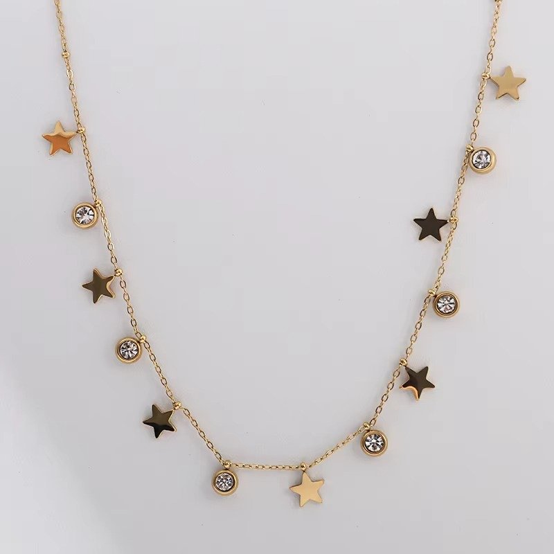 The Aureline Necklace captures celestial elegance with a fine gold vermeil chain adorned with clear, sparkling CZ stones set between delicate star-shaped charms. Graceful and light-catching, it adds a soft shimmer and starlit charm to any neckline.