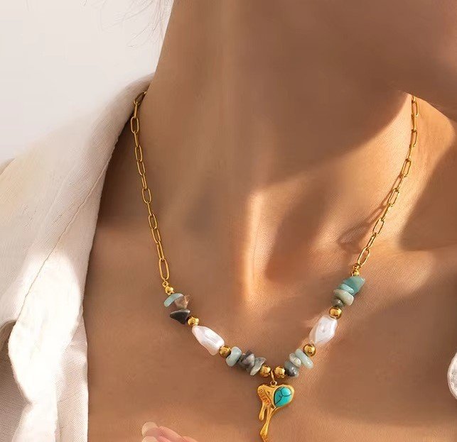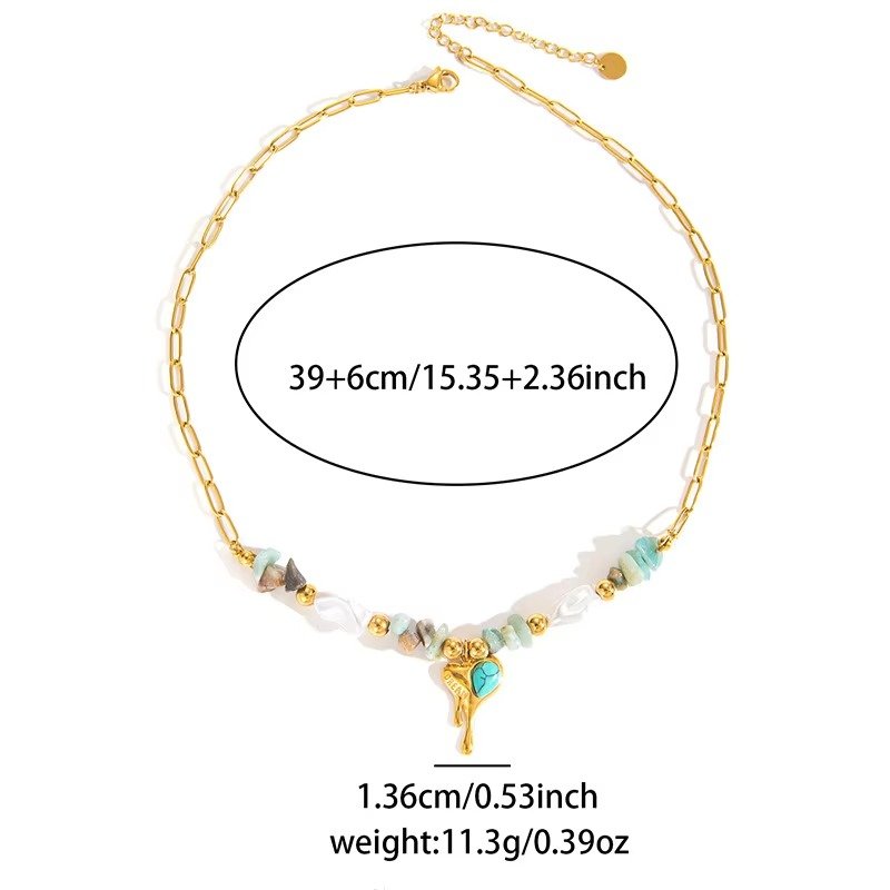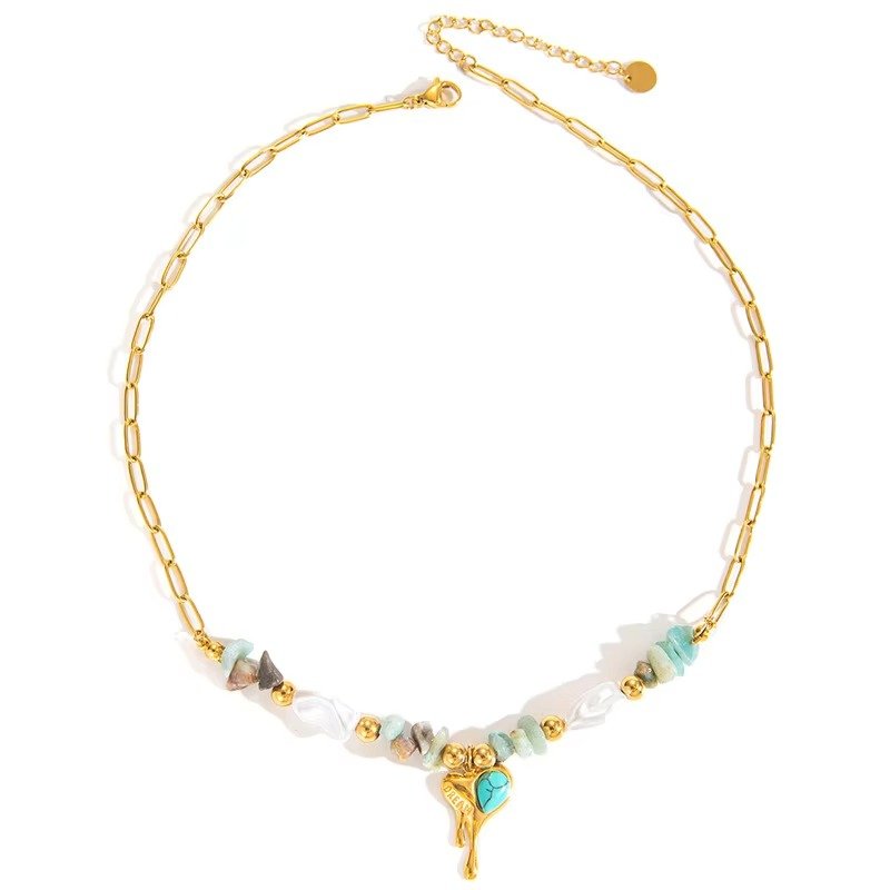 Channel the beauty of celestial balance and earthly elements with the Blue Orbit Necklace—a captivating blend of elegance and bohemian flair. This necklace features a fine gold-toned paperclip chain that gracefully meets a vibrant array of semi-precious gemstone chips, lustrous pearls, and metallic accents. At its heart lies a unique turquoise-inlaid charm in a gold sculpted drop, adding a statement of individuality and wanderlust.