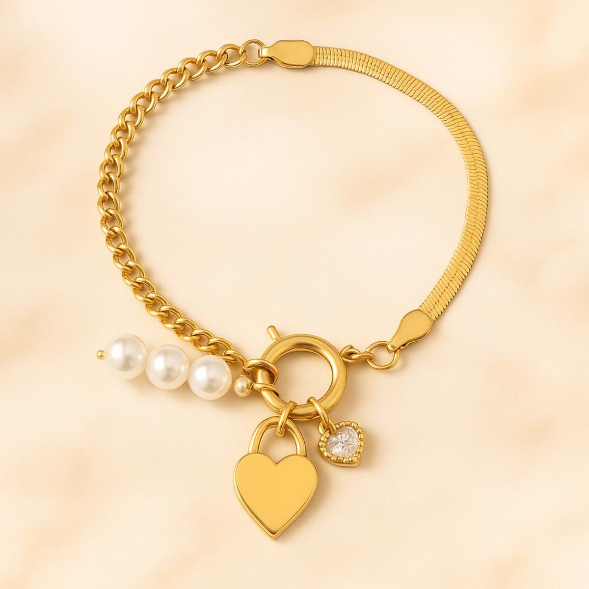 The Lunette Charm Bracelet blends softness and shine with a string of pearls, a polished gold heart, and a delicately set heart-shaped stone charm. Each detail adds a layer of romance and refinement to the graceful gold-plated chain.