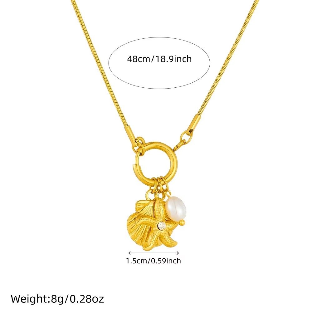 Graceful and sun-kissed, the Emilia Coastal Essence Necklace captures the serenity of the sea in a refined charm ensemble. Suspended from a polished gold vermeil chain, it features a trio of ocean-inspired treasures: a shimmering gold starfish, a textured shell, and a single lustrous pearl.