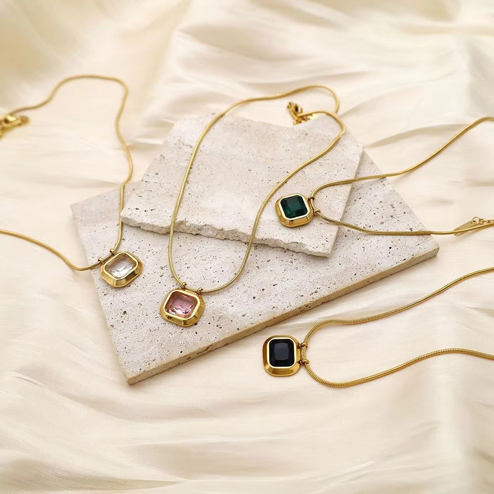 Elegant and timeless, the Emma Stone Necklace features a sleek rectangular gemstone—available in classic Crystal, bold black, soft pink, or rich green—set in a lustrous gold vermeil bezel. Suspended from a delicate yet durable chain, this minimalist pendant necklace adds a refined touch to any look.
