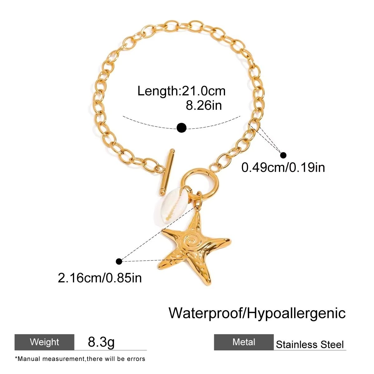 The Fiora Charm Bracelet brings together a sleek clip link chain with delicate star and shell charms for a look that’s both refined and playful. The gold-plated finish adds warmth, while the charm details evoke a subtle seaside spirit.