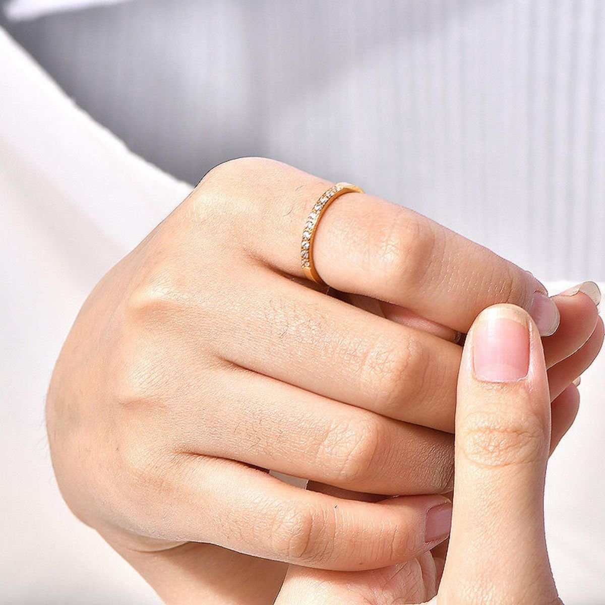Expertly crafted from 316L stainless steel and finished with 18k PVD gold plating, this gold eternity ring is waterproof, hypoallergenic, and tarnish-resistant—perfect for everyday wear while maintaining its luxurious shine.