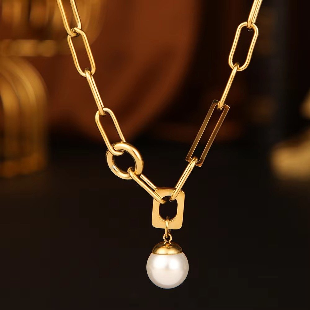 Modern minimalism meets classic charm in the Giulia Pearl Drop Necklace. Crafted from lustrous gold vermeil, this piece features a bold paperclip chain anchored by a single, radiant pearl drop charm—a perfect balance of structure and softness.