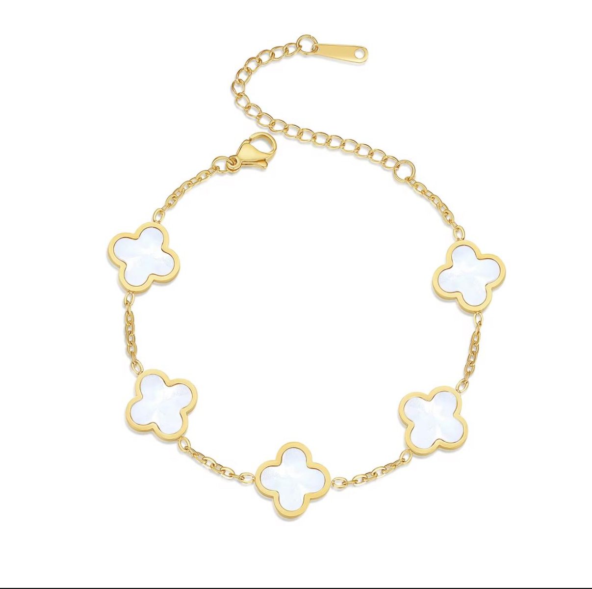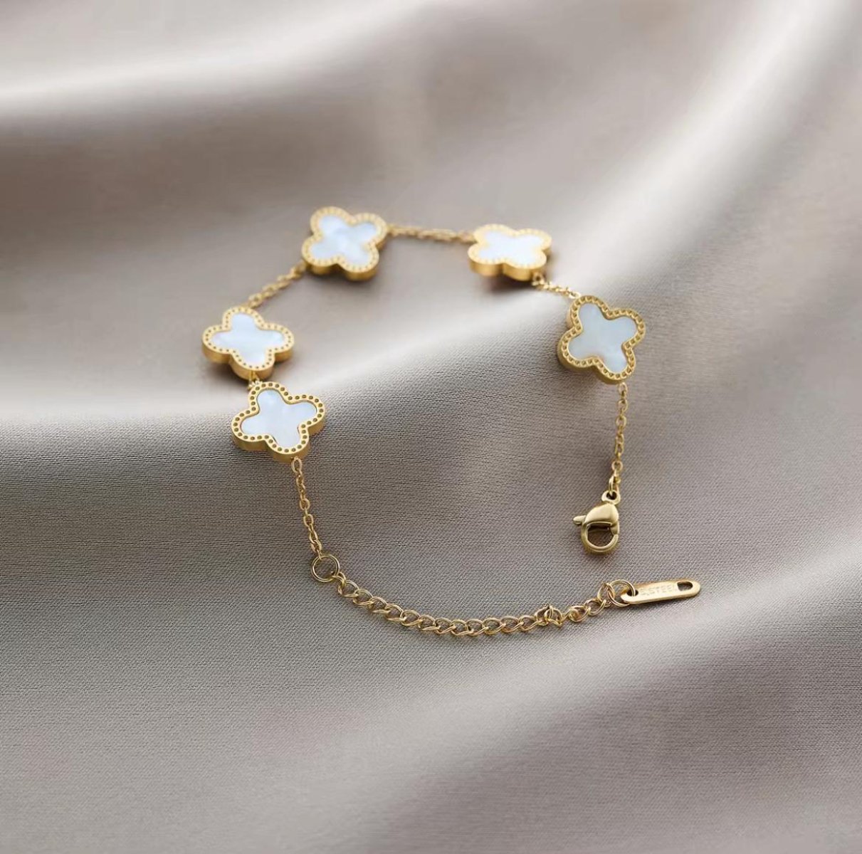 The Ivoura Bracelet draws inspiration from timeless icons, featuring five mother-of-pearl clover motifs, each bordered in radiant gold vermeil. Softly luminous and rich in symbolism, it brings elegance, luck, and refinement to your wrist.