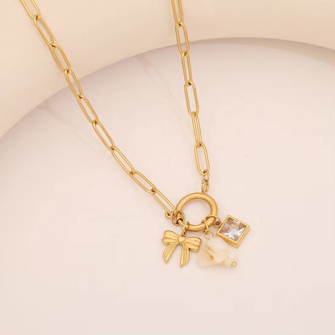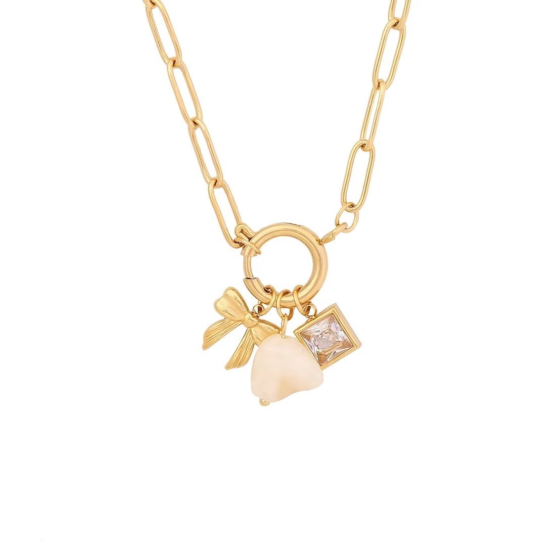 Delicate yet statement-making, the Marbella Charms Necklace is a graceful blend of feminine charm and modern elegance. Suspended from a bold paperclip chain, it showcases a refined trio of golden accents: a polished bow, a raw pearl-like stone, and a square-cut crystal charm—each adding its own note of sparkle and softness.