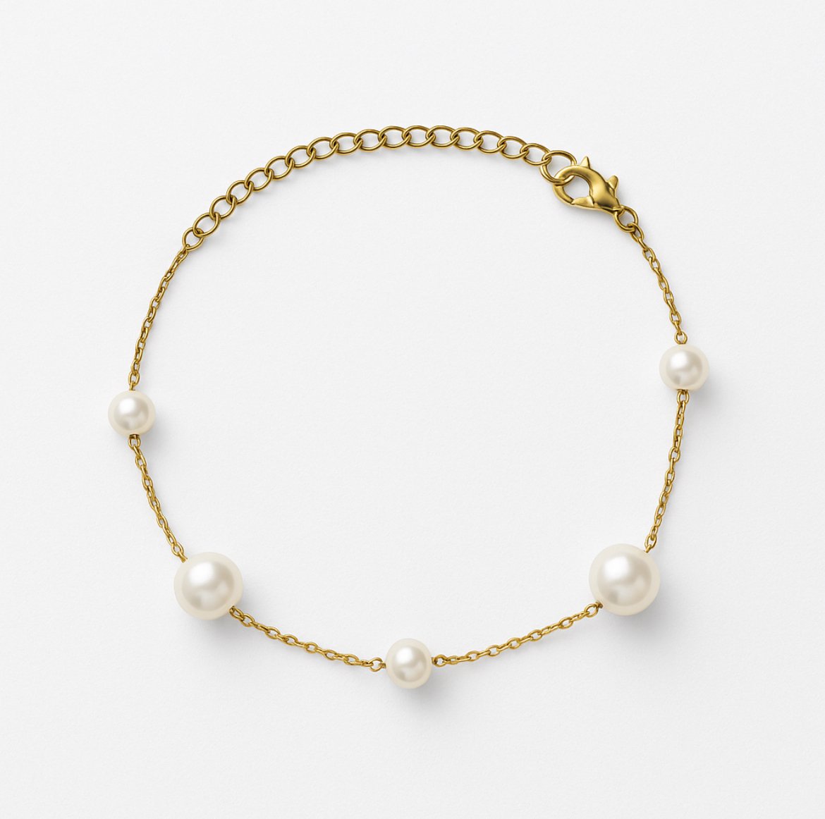 The Pearlina Bracelet features a delicate gold-plated chain adorned with alternating large and small pearls, creating a soft rhythm of shape and shine. Light and graceful, it blends classic femininity with a fresh, modern silhouette.