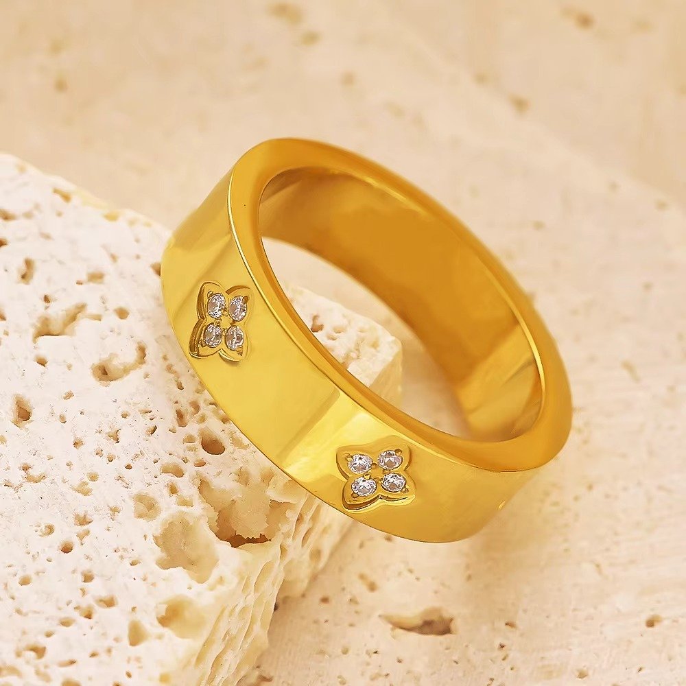 The Remi Ring makes a statement with its wide, polished gold band, while softening the look with intricate floral inlays—each petal dotted with shimmering stones. The design merges classic structure with subtle embellishment, offering a piece that’s both refined and radiant.