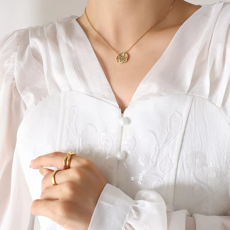 The Rose Royale Necklace features an intricate, gold-toned pendant shaped like a blooming rose with delicate, layered petals. At the center of the flower, a sparkling crystal adds a touch of brilliance and elegance. The pendant hangs from a fine, matching gold chain, making it a sophisticated and timeless piece that embodies grace and beauty. Perfect for elevating any outfit with its luxurious floral design.