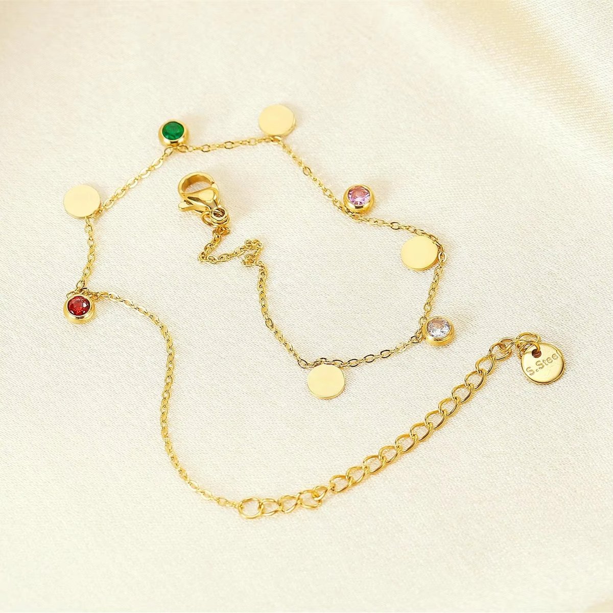 The Rosina Dainty Bracelet is a soft celebration of color and light, featuring tiny colored CZ stones interspersed with polished gold vermeil circle discs. With gentle movement and radiant charm, it’s a delicate piece that catches the eye with every flick of the wrist.