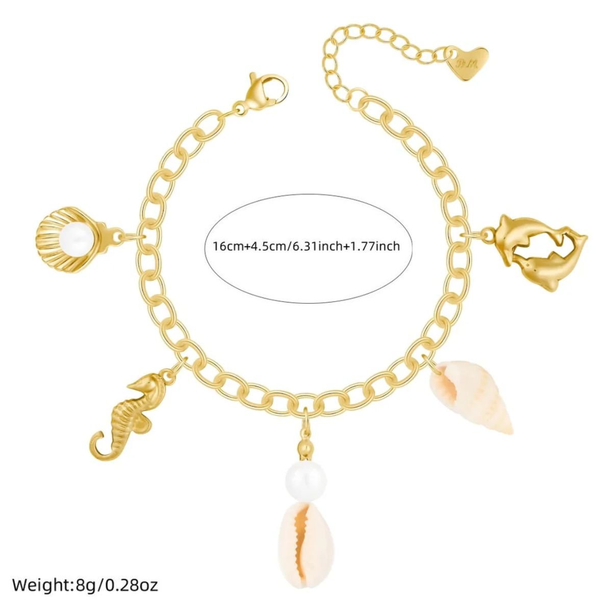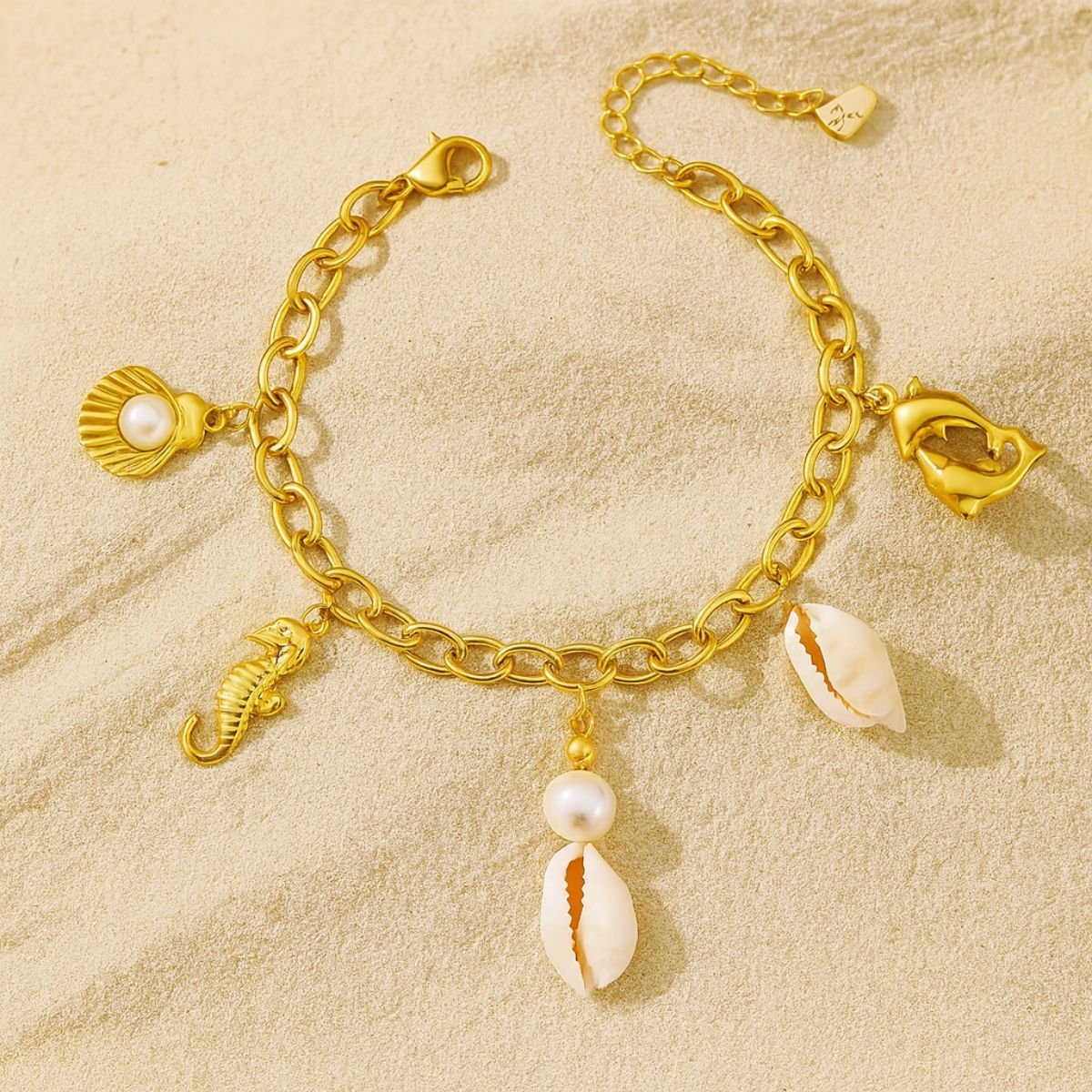 Crafted from durable 316L stainless steel and coated with 18k PVD gold plating, this bracelet is waterproof, tarnish-resistant, and hypoallergenic, making it perfect for daily wear or beach getaways. Each charm is carefully detailed to reflect the beauty of marine treasures, while the adjustable clasp ensures a comfortable and secure fit.