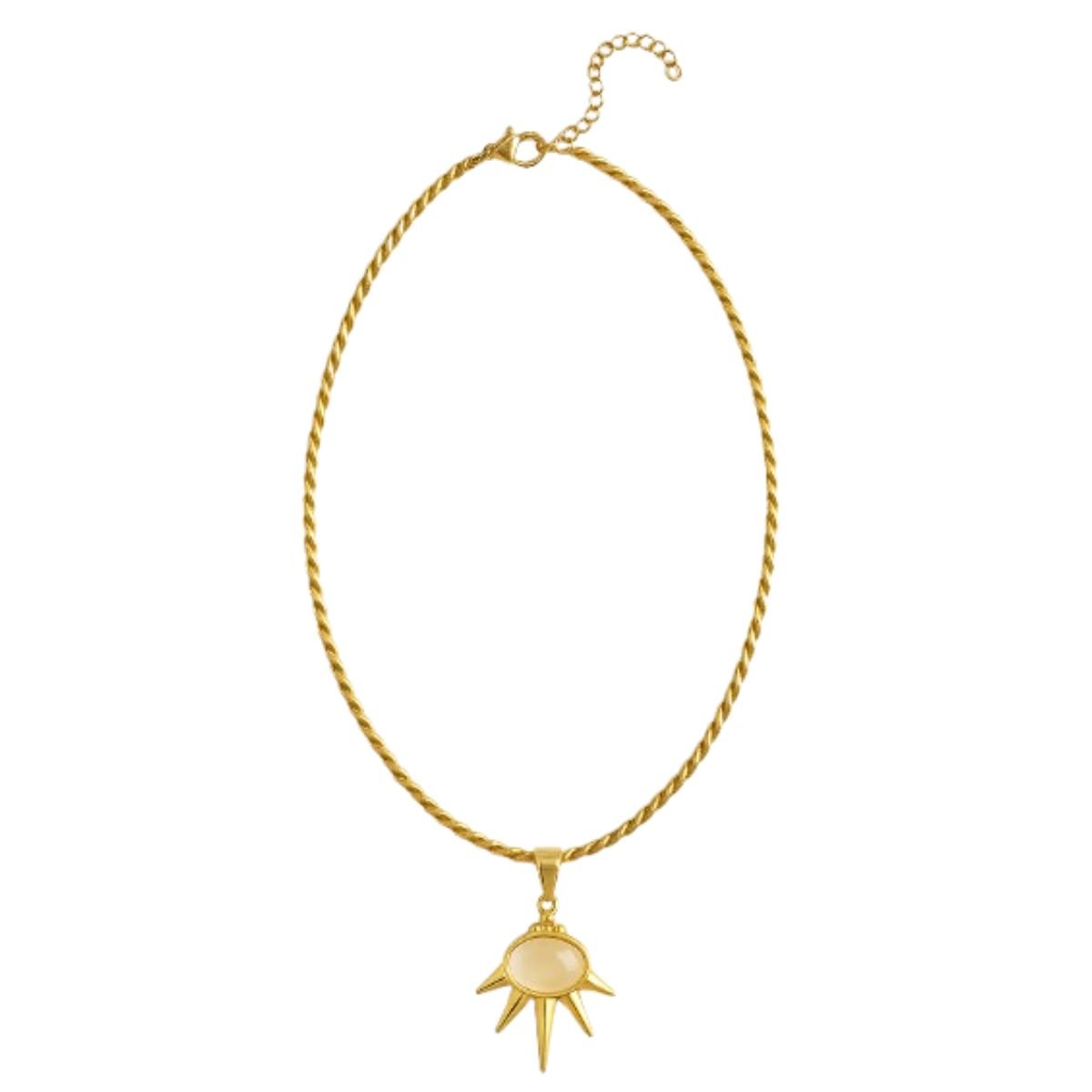 The Solara Mother of Pearl Necklace captures the radiant beauty of the sun, featuring a luminous mother of pearl pendant framed in a striking gold vermeil sunburst design. Its elegant rope-style gold chain necklace adds depth and texture, creating a piece that feels both timeless and bold. A symbol of light and strength, this necklace brings a touch of celestial elegance to your everyday look.