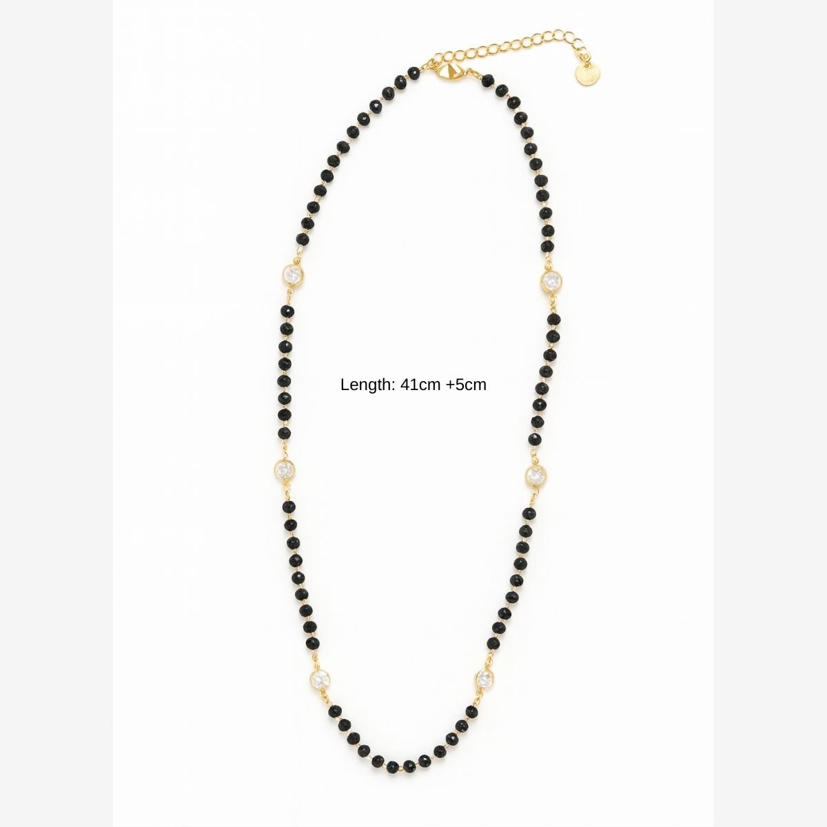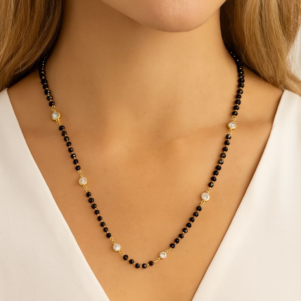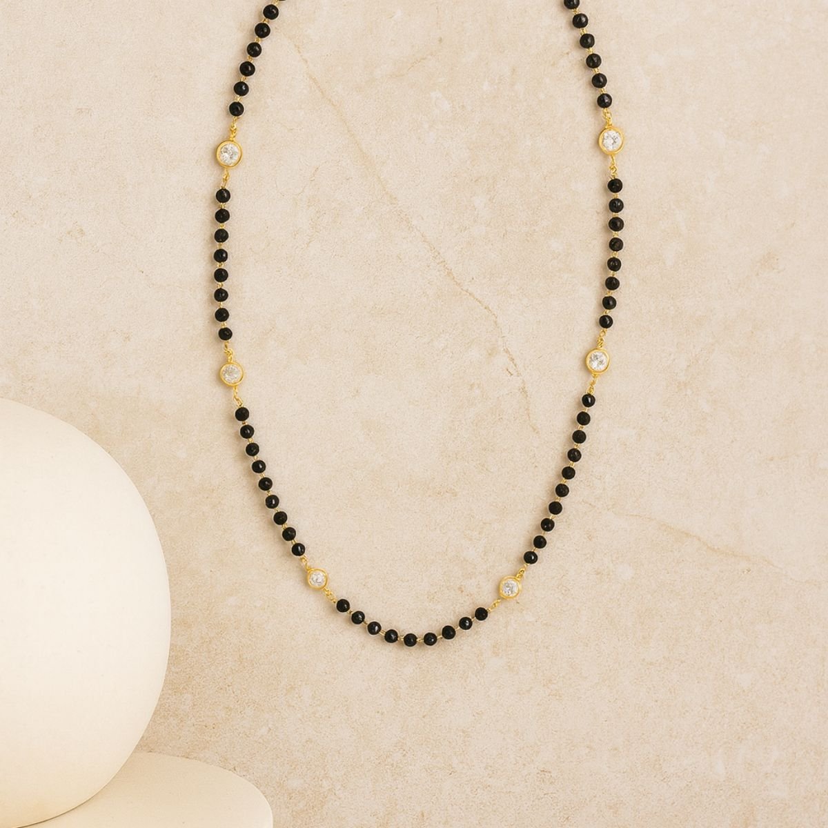 Crafted with fine black beaded detailing and adorned with luminous Swarovski crystal stations, this necklace strikes the perfect balance between heritage and sophistication. The minimal yet striking design makes it versatile enough to be worn daily, at work, or for special occasions, blending seamlessly with both ethnic and western outfits.